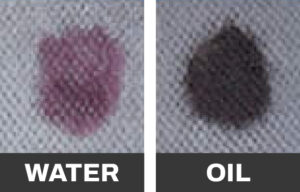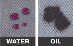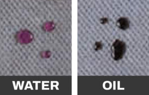 This silicone treated fabric repelled water but quickly absorbed the oil spill. A fabric treated with Hendrick Autoguard Fabric Protection with Banoyl¨ repels both water and oil spills. |